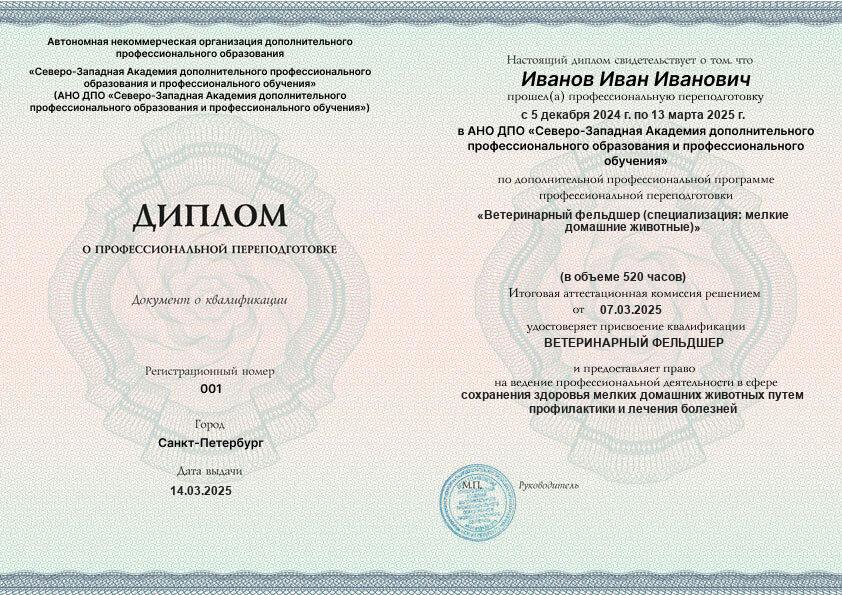 Вы станете полноценным помощником ветврача, сможете самостоятельно вести прием и выполнять медицинские процедуры. Дальнейшие карьерные перспективы ограничены только вашими амбициями.