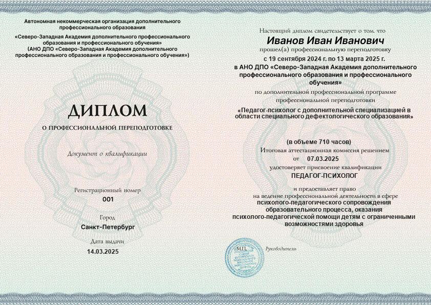 Курс обучения Педагог-психолог с дополнительной специализацией в области специального дефектологического образования (710ч)