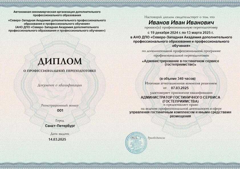 - Квалификация: Администратор гостиничного сервиса (гостеприимства)