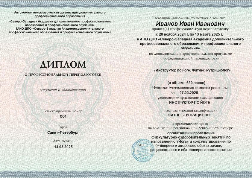 Каждый документ (диплом/удостоверение/свидетельство) соответствует п.2 ст.60 N-273 ФЗ, оформляется на русском языке, печатается на типографском бланке, защищённом от подделок. Ставится официальная печать образовательной организации. С образцами документов можно ознакомиться на сайте в разделе «Лицензия и документы».