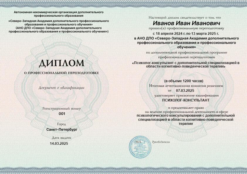 Курс обучения Психолог-консультант с дополнительной специализацией в области когнитивно-поведенческой терапии (1200ч)
