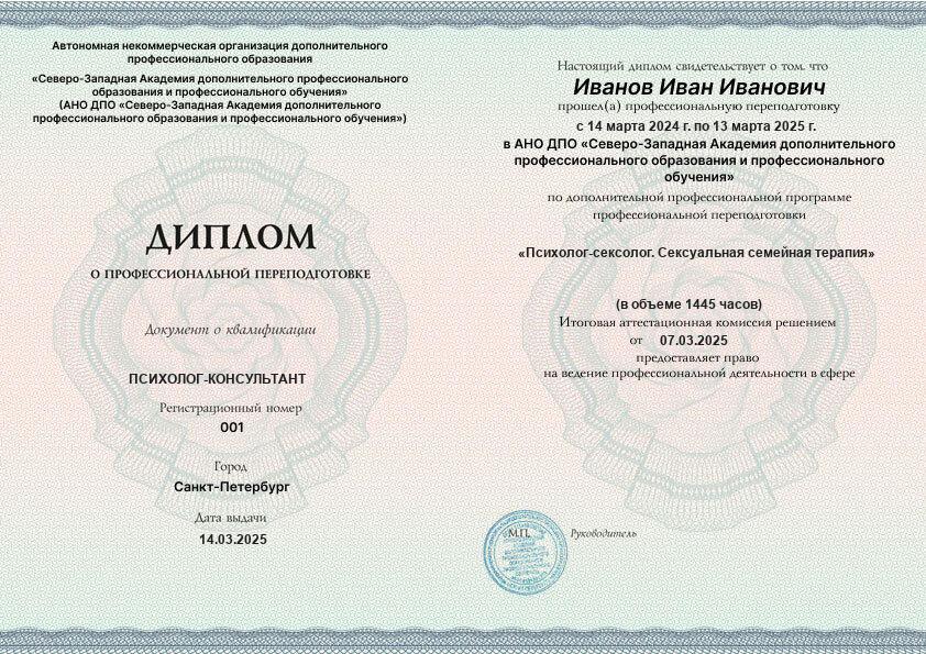 Курс Психолог-сексолог. Сексуальная семейная терапия (1445ч)