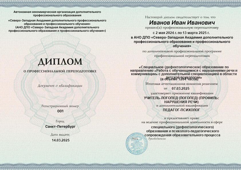- 2 квалификации: Учитель-логопед (логопед) (профиль: нарушения речи) + Педагог-психолог