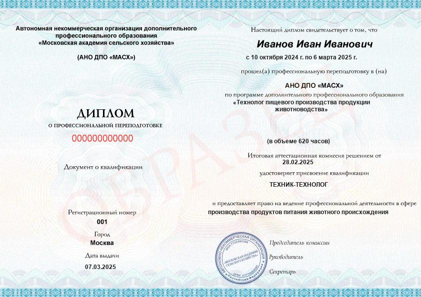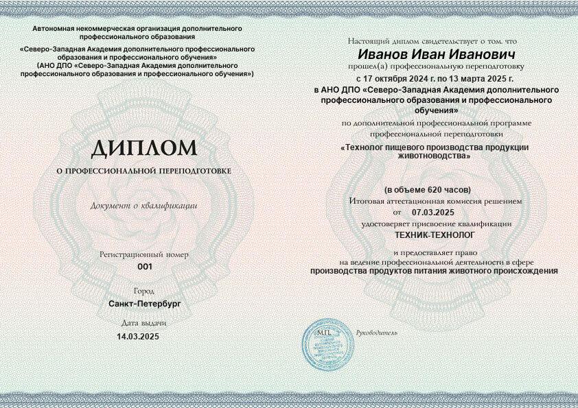 Курс обучения Технолог пищевого производства продукции животноводства (620ч)