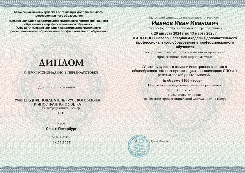После обучения получите диплом с двумя квалификациями: учитель русского/иностранного языка и репетитор. Это позволит преподавать в государственных и частных учреждениях, а также работать на себя.