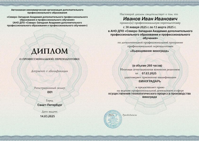 Каждый документ (диплом/удостоверение/свидетельство) соответствует п.2 ст.60 N-273 ФЗ, оформляется на русском языке, печатается на типографском бланке, защищённом от подделок. Ставится официальная печать образовательной организации. С образцами документов можно ознакомиться на сайте в разделе «Лицензия и документы».